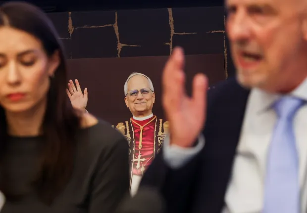 A photograph of Pope Leo XIV rests on a table behind Peter Isely, one of the founders of Survivors Network of those Abused by Priests and a survivor of sexual abuse by a priest, as he speaks during a news conference discussing Pope Leo XIV’s past and what SNAP would like him to do regarding sexual abuse in the Catholic church, on May 20, 2025. (Eileen T. Meslar/Chicago Tribune)